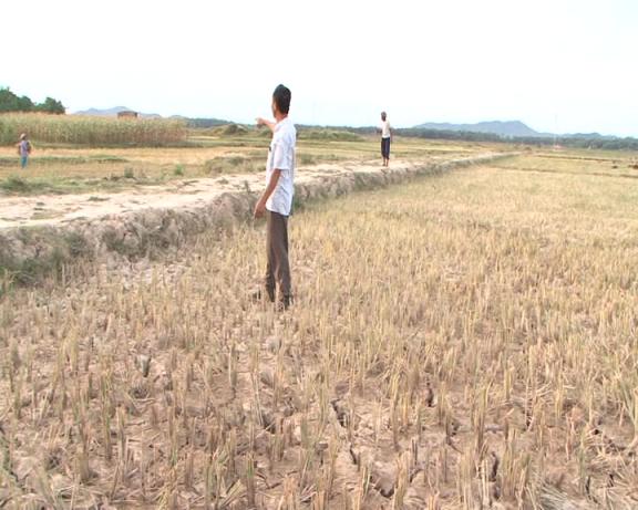 Đây là những thửa ruộng cơ cấu lúa thu mùa của bà con nông dân xã Mỹ sơn. Theo đúng lịch thời vụ, để tránh lụt, việc gieo cấy đáng ra phải hòan thành. Song do khô hạn đã khiến cho đồng ruộng khô nứt nẻ. Gia đình ông Đặng Quang Tuấn-xóm 1 có 6 sào ruộng, thì cả 6 đều bị bỏ hoang khiến ông vô cùng lo lắng, bởi cuộc sống cả gia đình ông đều trông chờ vào mấy sào ruộng này. Cùng nỗi lo như ông Tuấn, ruộng của gia đình ông Nguyễn Văn Thường ở xóm 3, giờ có nguy cơ mất trắng. Cánh đồng xóm 3 Mỹ sơn nằm sat trạm bơm. Thế nhưng, chỉ bơm được 3 ngày thì nguồn nước sông Khuôn khô cạn. Những thửa ruộng vưà gieo giống đã khô nứt nẻ, có số thì ủ giống rồi không thể gieo.