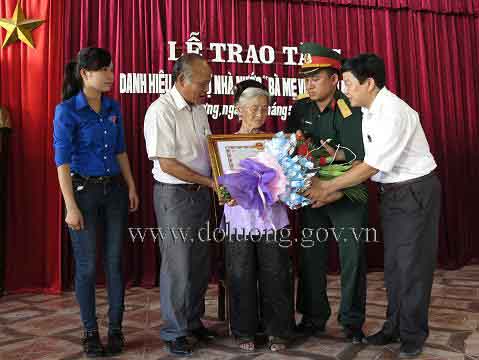 Đ/c Trương Hồng Phúc – TUV, BT.HU, CT.HĐND huyện và đ/c Nguyễn Minh Hạnh – phó chủ tịch UBND huyện đã trao danh hiệu bà mẹ Việt Nam anh hùng tới mẹ Nguyễn Thị Nha và thân nhân các mẹ Việt Nam anh hùng.