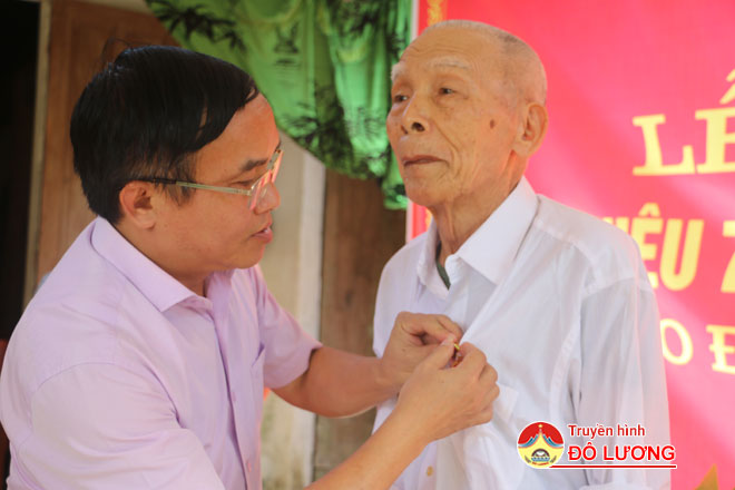 Đồng chí Ngọc Kim Nam – Bí thư huyện ủy trao huy hiệu 70 năm tuổi Đảng cho đồng chí Phan Sỹ Linh, xã Tràng Sơn