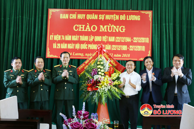 Các đồng chí thường trực Huyện ủy đã tặng hoa chúc mừng cán bộ chiến sỹ BCH Quân sự huyện nhân ngày truyền thống quân đội nhân dân Việt Nam và ngày hội Quốc phòng toàn dân, tiếp tục hoàn thành xuất sắc nhiệm vụ Đảng, Nhà nước và Quân đội nhân dân giao phó.
