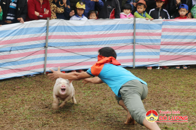 Trò chơi bịt mắt bắt lợn thu hút đông đảo khán giả xem và cổ vũ. Ảnh: Hữu Hoàn