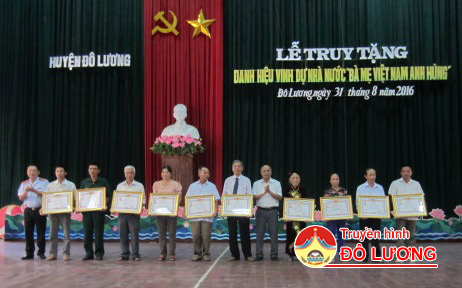 Chiều ngày 31/8/2016, huyện Đô Lương đã tổ chức buổi lễ truy tặng danh hiệu vinh dự nhà nước bà mẹ Việt Nam anh hùng. Tới dự buổi lễ có các đồng chí: Vi Văn Sửu – Chánh thanh tra tỉnh Nghệ An; Trương Hồng Phúc – Tỉnh ủy viên, bí thư huyện ủy; Lê Minh Giang – Phó bí thư thường trực huyện ủy, chủ tịch HĐND huyện; Ngọc Kim Nam – Phó bí thư, chủ tịch UBND huyện; các đ/c trong Ban thường vụ huyện ủy, và thân nhân gia đinh các bà mẹ Việt Nam anh hùng.