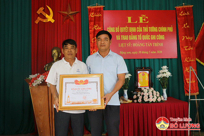 Đồng chí Hoàng Ngọc Tuấn – Bí thư BCH Đảng bộ, Chủ tịch HĐND xã Đặng Sơn đã trao bằng Tổ quốc ghi công tới thân nhân gia đình. Ngay sau buổi lễ các đại biểu và nhân dân đã rước bằng về nhà thờ và tổ chức lễ dâng hương.
