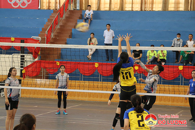 Trận đấu diễn ra giữa đội tuyển bóng chuyền nữ Đô Lương và Yên Thành. Ảnh: Hữu Hoàn