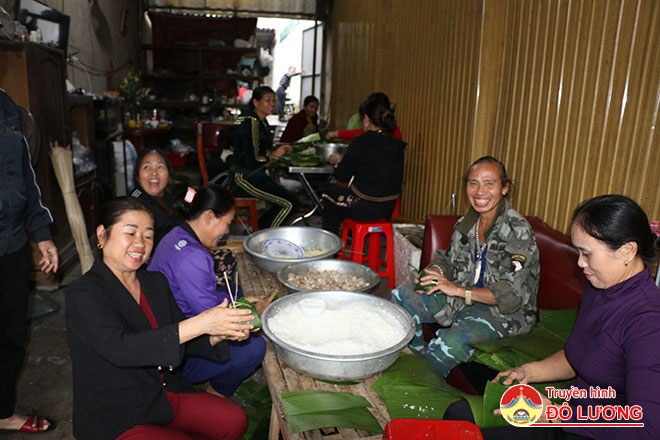 Nhóm Đô Lương ” Kết nối yêu thương” đang gói 3000 bánh chưng tại cơ sở bánh chưng Nhật Nguyên xóm 3 xã Đà Sơn để hỗ trợ nhân dân miền trung. Ảnh: Hữu Hoàn