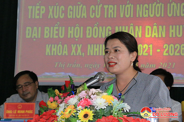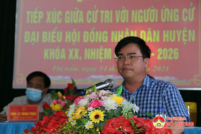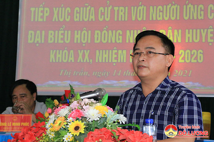 Tại buổi tiếp xúc với cử tri, Thường trực mặt trận tổ quốc xã Thị trấn đã báo cáo tóm tắt tiểu sử và quá trình công tác của 8 ứng cử HĐND huyện Đô Lương nhiệm kì 2021 – 2026 thuộc tổ bầu cử số 5 gồm ông: Hoàng Văn Hiệp – Phó bí thư Huyện ủy, Chủ tịch UBND; Nguyễn Đình Khương – Ủy viên Ban thường vụ, Trưởng ban tổ chức huyện ủy; Lê Minh Phúc – Phó trưởng ban tổ chức Huyện ủy; Đặng Văn Bảy – Phó trưởng ban kinh tế – xã hội HĐND huyện; Trần văn Sơn – Huyện ủy viên, Chủ tịch UBND Thị trấn, Bùi Văn Tám – Phó chủ tịch UBND xã Đông Sơn; Bùi Thị Hoài Nam và Hoàng Thị Oanh – Giáo viên Trường THCS Tràng Sơn.