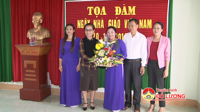 Đồng chí Nguyễn Thị Anh Quang – Phó chủ tịch UBND huyện tặng hoa chúc mừng ngày nhà giáo Việt Nam tới tập thể giáo viên trường mầm non xã Mỹ Sơn