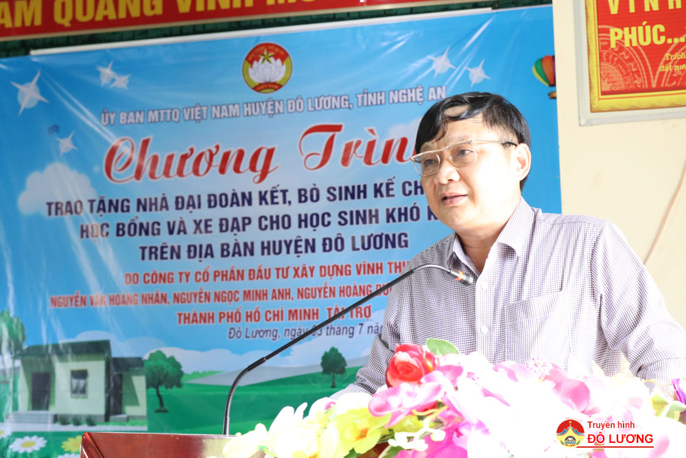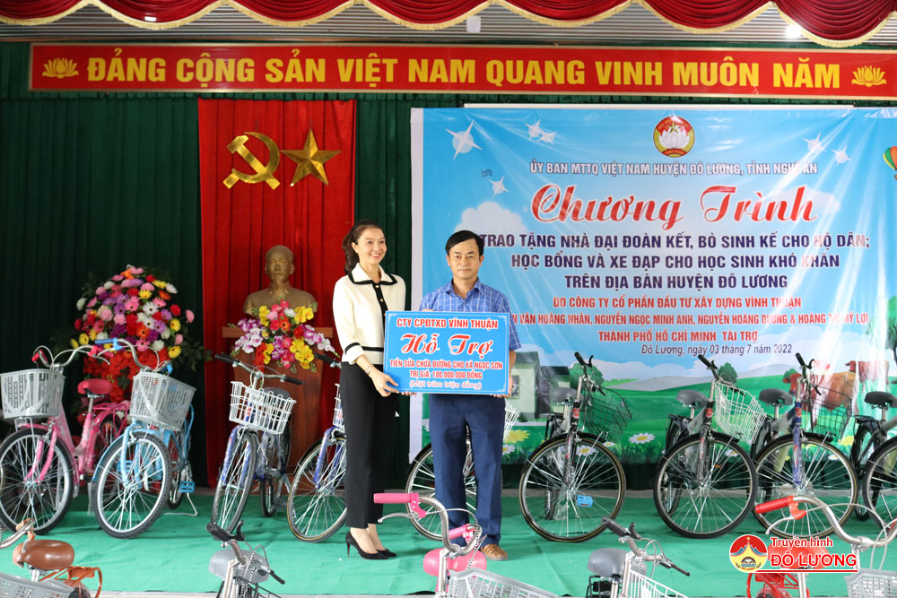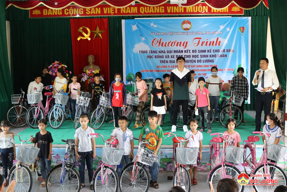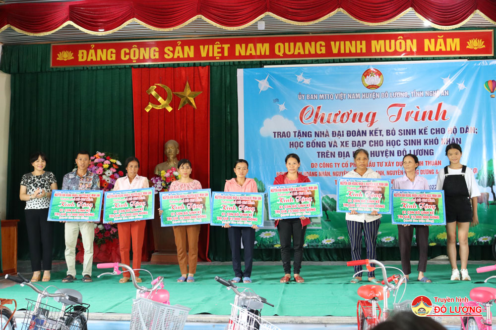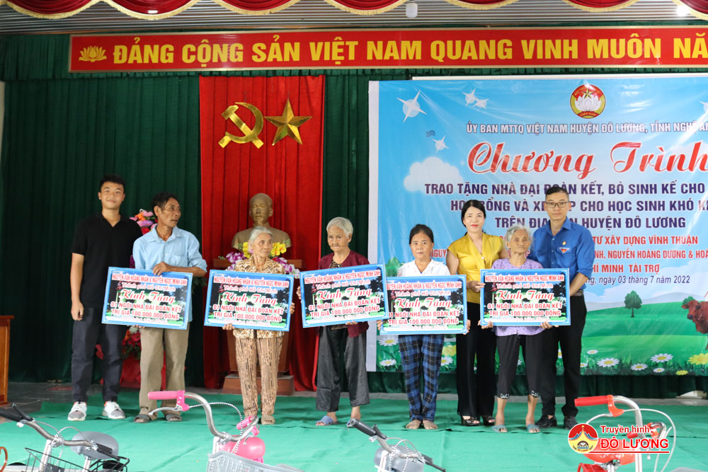 Sáng ngày 3/7, tại xã Hiến Sơn và Ngọc Sơn, UBMTTQ huyện Đô Lương tổ chức chương trình trao tặng nhà Đại đoàn kết, bò sinh kế cho các hộ nghèo; trao học bổng và xe đạp cho học sinh khó khăn. Tham dự có bà Phan Thị Kim Oanh – Phó chủ nhiệm Văn phòng Chủ tịch nước; đồng chí Hoàng Hữu Hùng – Trưởng ban Dân vận Huyện ủy, Nguyễn Trung Thành – Phó chủ tịch UBND huyện, Vương Thị Quý – Chủ tịch UBMTTQ huyện; Thái Khắc Phú – Chỉ huy trưởng Ban chỉ huy Quân sự huyện; Trần Thị Huyền Mơ – Quyền Bí thư Huyện đoàn; đại diện lãnh đạo Công ty Cổ phần đầu tư xây dựng Vĩnh Thuận và các nhà hảo tâm.
