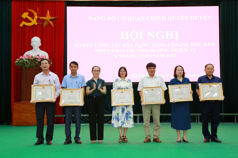 Nhân dịp này, được sự ủy quyền của cấp trên, đồng chí Hoàng Văn Hiệp – Phó Bí thư Huyện ủy, Chủ tịch UBND huyện, Nguyễn Thị Anh Quang – Phó Chủ tịch UBND huyện đã trao Bằng khen của chủ tịch UBND tỉnh cho 5 tập thể và 7 cá nhân của Đảng bộ Cơ quan chính quyền huyện vì đã có thành tích xuất sắc trong công tác năm 2021.