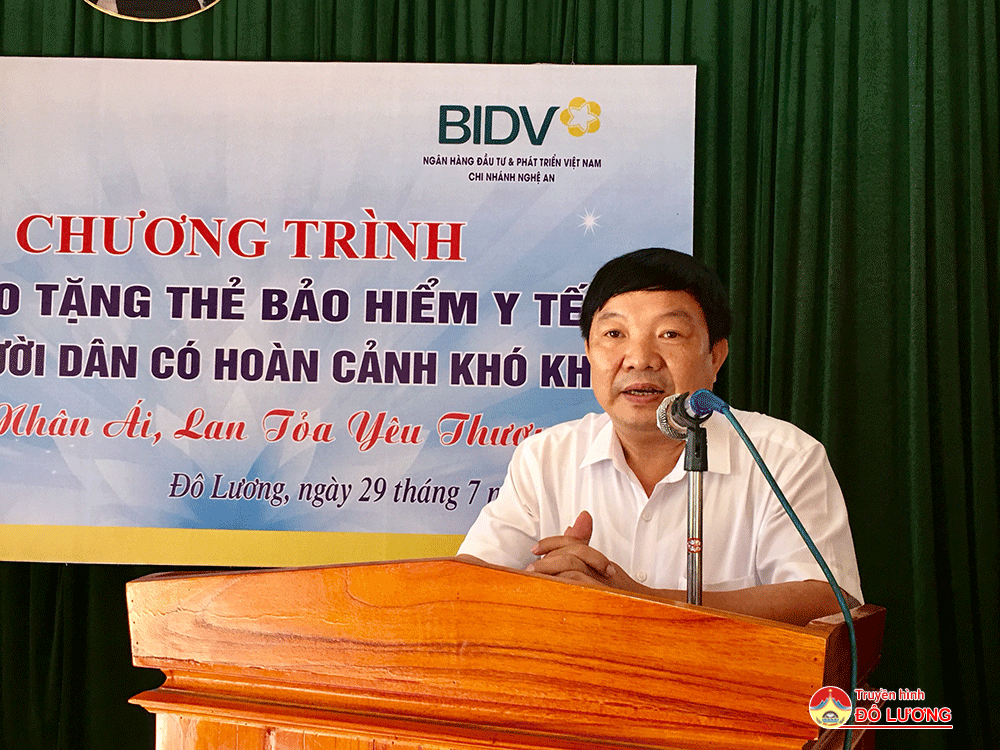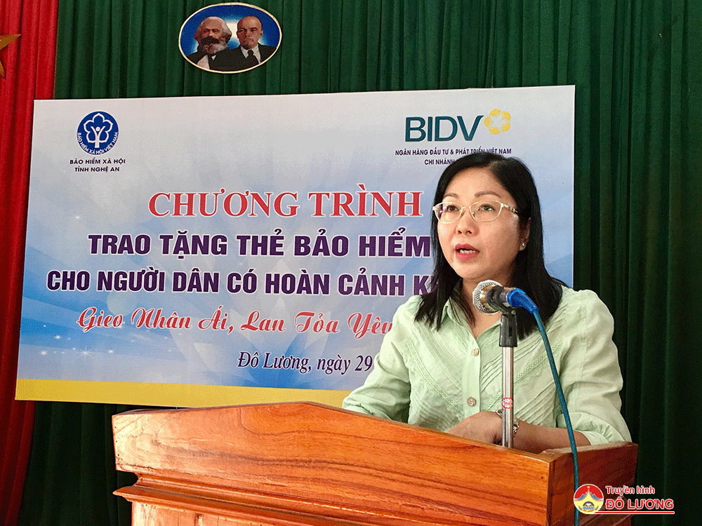 Sáng ngày 29/7, Bảo hiểm xã hội tỉnh cùng BHXH huyện Đô Lương đã phối hợp với Ngân hàng đầu tư và phát triển Việt Nam- Chi nhánh Nghệ An, Chi nhánh Ngân hàng chính sách xã hội tỉnh tổ chức chương trình trao tặng thẻ bảo hiểm y tế cho người dân có hoàn cảnh khó khăn. Tham dự có bà Lê Thị Dung – Phó giám đốc Bảo hiểm xã hội tỉnh, ở huyện có đồng chí Nguyễn Minh Hạnh – Ủy viên Ban Thường vụ, Trưởng ban Tuyên giáo, Giám đốc Trung tâm chính trị huyện.