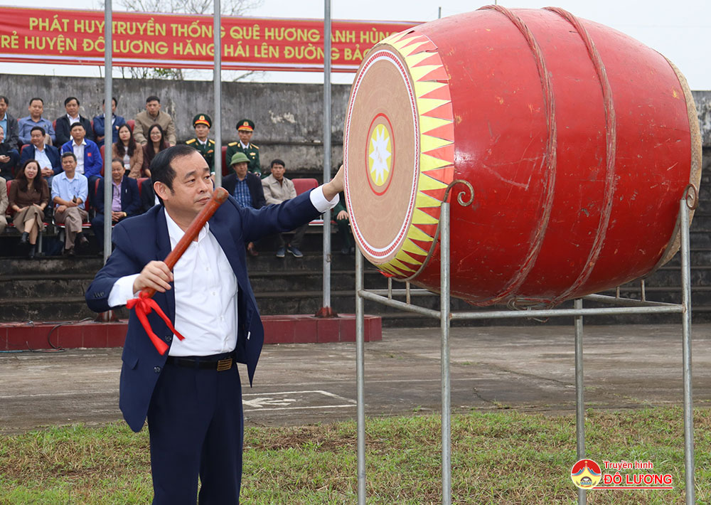 Tiếp đó, đồng chí Hoàng Văn Hiệp – Phó Bí thư Huyện ủy, Chủ tịch UBND huyện đánh trống mở hội giao quân.