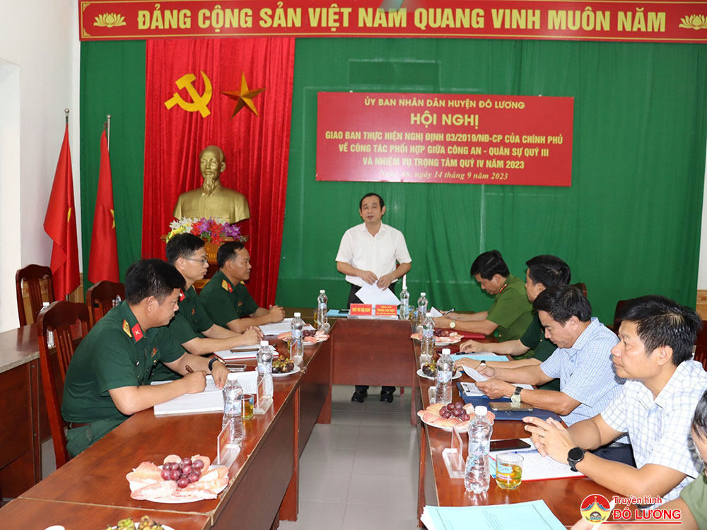 Chiều 14/9, tại đơn vị Kho kỹ thuật K2, UBND huyện Đô Lương đã tổ chức hội nghị giao ban thực hiện Nghị định 03/2019/NĐ – CP của Chính Phủ về công tác phối hợp giữa Công an- Quân sự quý 3 và nhiệm vụ trọng tâm quý 4 năm 2023. Đồng chí Hoàng Văn Hiệp, Phó bí thư Huyện ủy – Chủ tịch UBND huyện chủ trì hội nghị. Tham dự có lãnh đạo Công an huyện, Ban chỉ huy quân sự huyện, Sư đoàn 324, Xưởng 41 và Trung đoàn 1-Sư đoàn 324.