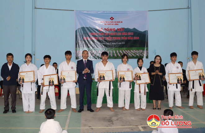 Nhân dịp này, Võ sư Lê Văn Trung- Phó chủ tịch Liên đoàn võ thuật Nghệ An, Trưởng Phân đường Nghĩa Dũng Karate Nghệ An; đại diện Phòng Văn hóa- Thông tin, Trung tâm Văn hóa- Thể thao và Truyền thông huyện Đô Lương đã trao giấy khen và tặng sách cho các CLB và VĐV.