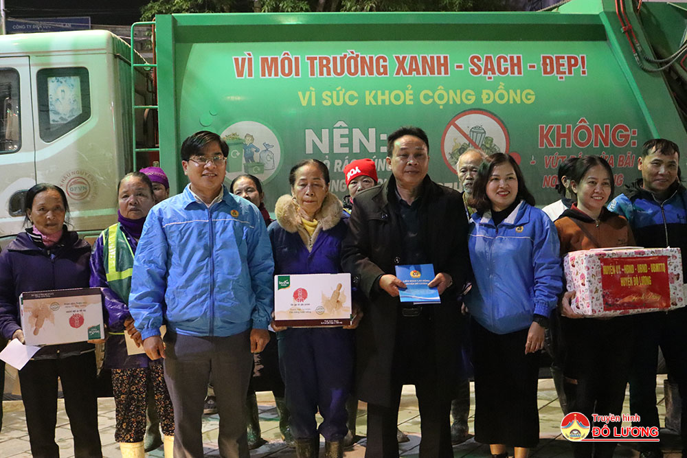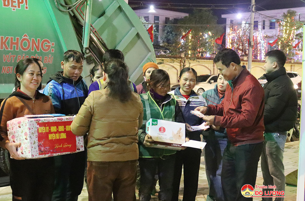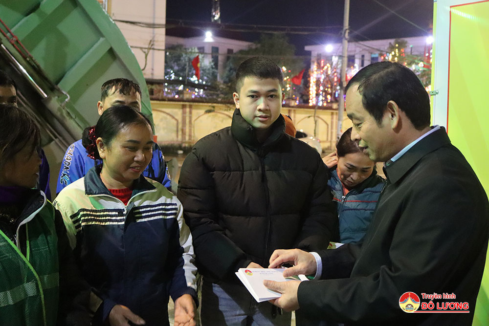 Nhằm chia sẻ với những nỗ lực của cán bộ và nhân viên HTX Dịch vụ và môi trường Đô Lương đang ngày đêm thu dọn vệ sinh rác thải tại Trung tâm Thị trấn Đô Lương để cho nhân dân vui tết, đón xuân sạch sẽ, đảm bảo môi trường, đồng chí Hoàng Văn Hiệp – Phó Bí thư Huyện ủy, Chủ tịch UBND huyện đã tặng HTX Dịch vụ và môi trường Đô Lương. Bao gồm, 1 thùng quà và 3 triệu đồng tiền mặt. Bên cạnh đó, đồng chủ tịch UBND huyện đã trao 30 suất quà cho cán bộ nhân viên, mỗi suất quà trị giá 500 nghìn đồng.
