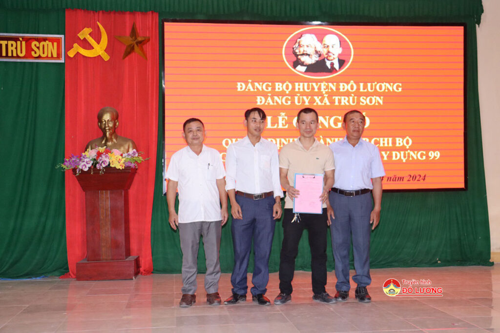 Thực hiện Đề án ban hành kèm theo Quyết định số 5155- QĐ/TU, ngày 8/02/2014 của Ban Thường vụ Tinh ủy và Kết luận 189- thực hiện Đề án “Phát triển đảng viên, tổ chức Đảng trong các Doanh nghiệp tư nhân và doanh nghiệp có vốn đầu tư nước ngoài”; Căn cứ Thông báo số 1119-TB/HU, ngày 01/4/2024 của Ban Thường Vụ Huyện ủy Đô Lương về chủ trương thành lập Chi bộ Công ty Cổ phần vật liệu xây dựng 99, trực thuộc Đảng ủy xã Trù Sơn. Chiều ngày 15/4, Đảng ủy xã Trù Sơn tổ chức lễ công bố Quyết định thành lập Chi bộ Công ty Cổ phần vật liệu xây dựng 99, trực thuộc Đảng ủy xã Trù Sơn.