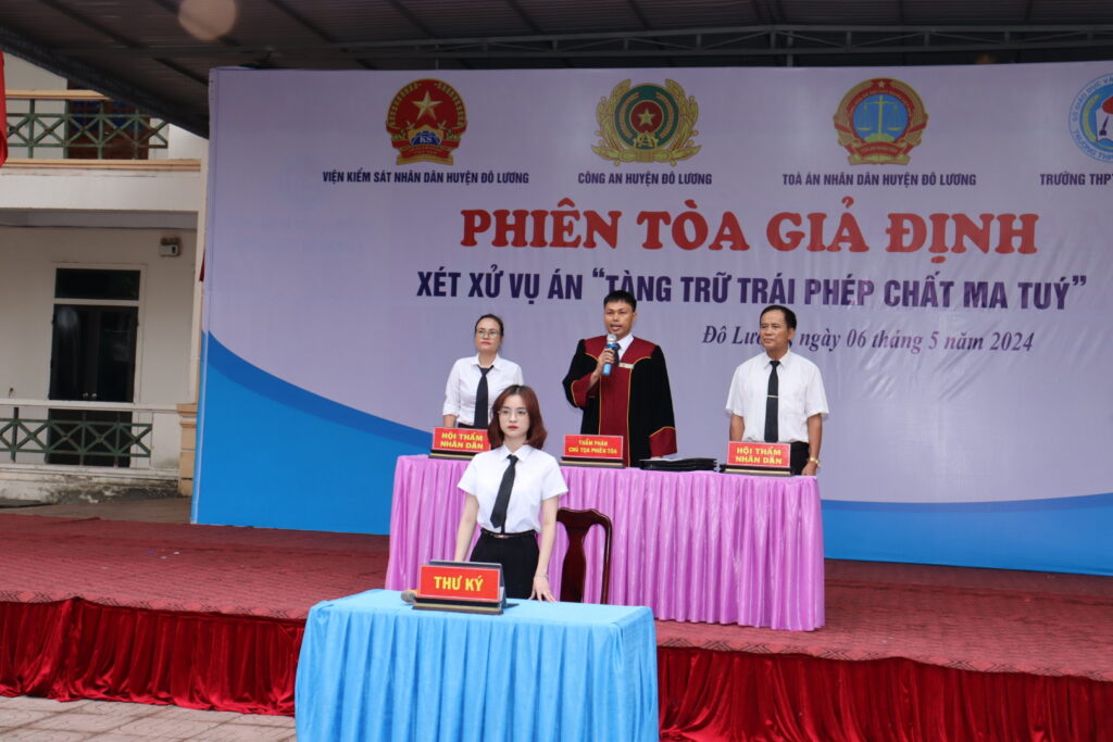 Sáng ngày 6/5/2024, Công an huyện Đô lương đã phối hợp cùng các đơn vị Tòa án, Viện kiểm sát và Trường THPT Đô Lương 2 tổ chức phiên tòa giả định về tội phạm ma túy. Tham dự có đồng chí Nguyễn Thị Anh Quang- PCT UBND huyện, đồng chí Chu Quang Thành – Trưởng công an huyện, đồng chí Thái Khác Phú – Chỉ huy trưởng BCHQS huyện; các ban, ngành đoàn thể cấp huyện và lãnh đạo một số xã.