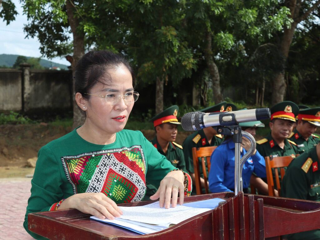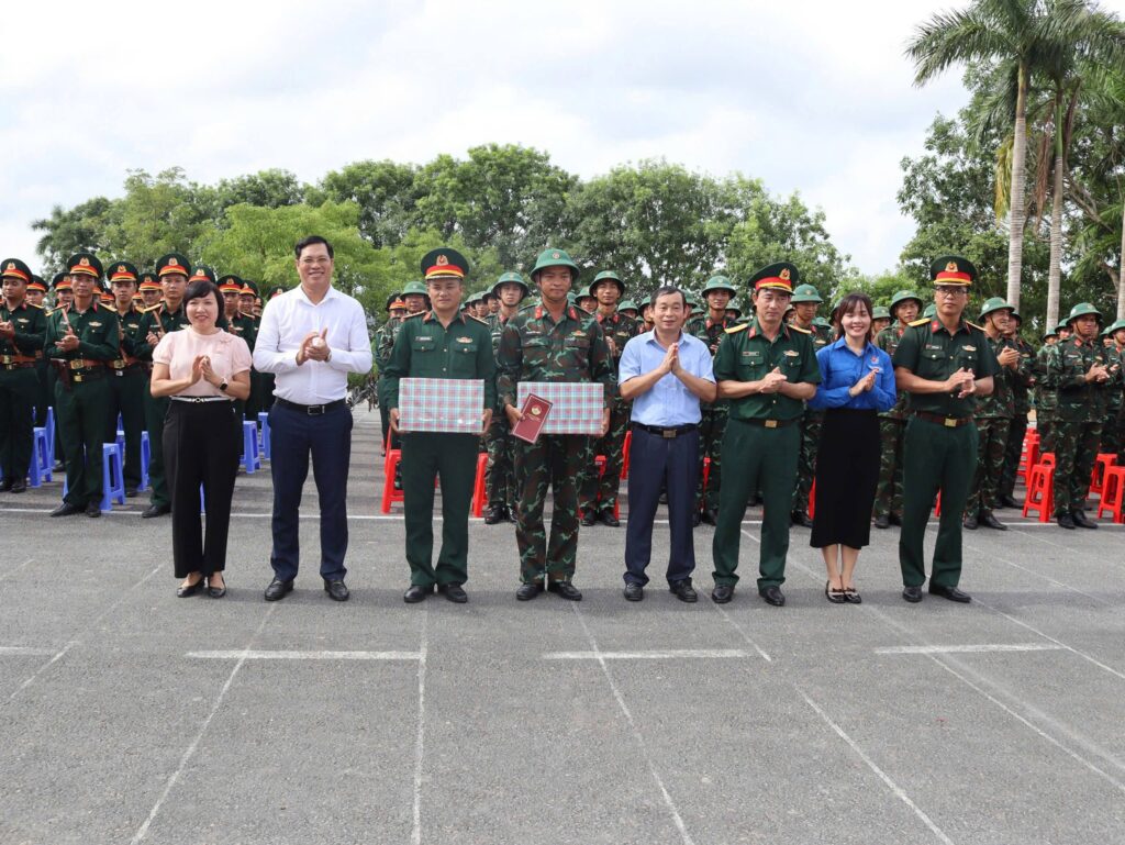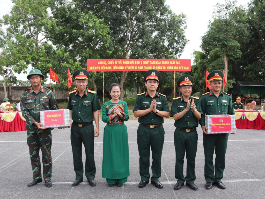 Đồng chí Võ Thị Minh Sinh và các đồng chí trong đoàn công tác của tỉnh, Quân khu 4 và các đồng chí lãnh đạo huyện Đô Lương đã tặng quà cho các cán bộ chiến sỹ Tiểu đoàn Diễu binh 2.