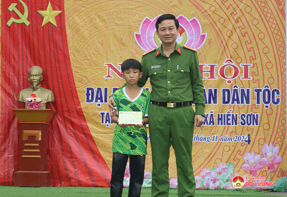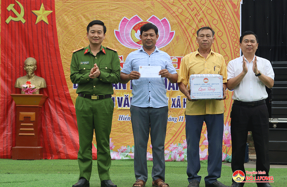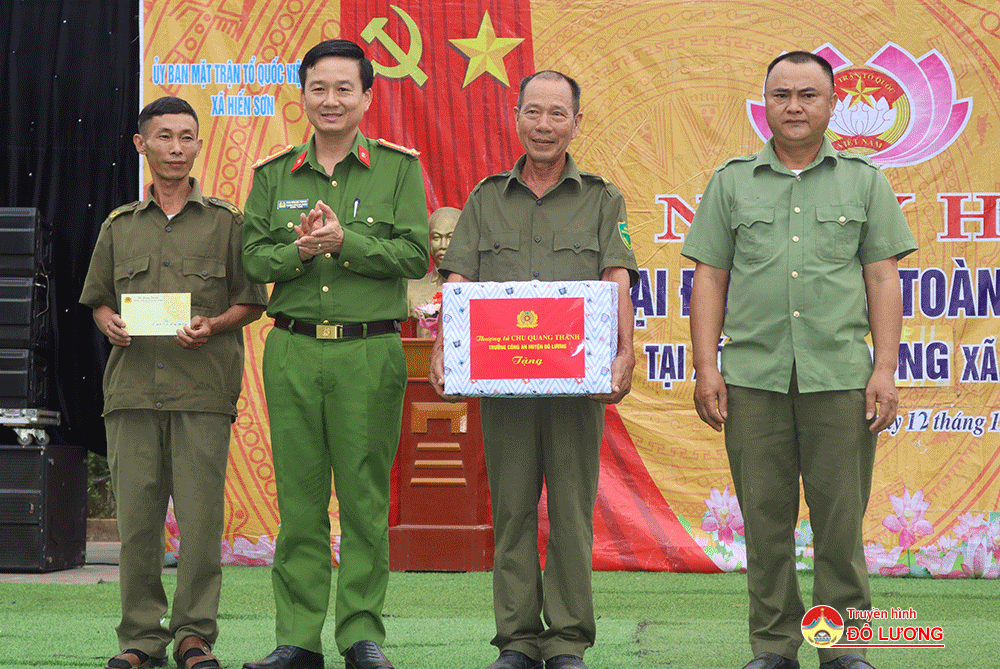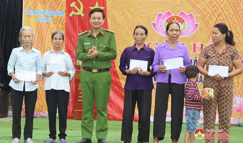 Dịp này, đồng chí Thượng tá Chu Quang Thành – Ủy viên Ban Thường vụ Huyện ủy, Trưởng Công an huyện và đồng chí Tăng Quốc Cường-Phó Ban Dân vận Huyện ủy đã trao quà của Huyện ủy, HĐND, UBND, UBMTTQ huyện gồm 2 hộp cờ Đảng, cờ Tổ quốc cho khu dân cư xóm Văn Đông, trao 5 suất quà, mỗi suất 500 ngàn đồng cho 5 hộ nghèo của xã Hiến Sơn. Đồng chí Trưởng Công an huyện đã quà cho Tổ an ninh trật tự xóm, trao quà cho cháu Trần Đăng Đô, hiện mồ côi cả cha lẫn mẹ.