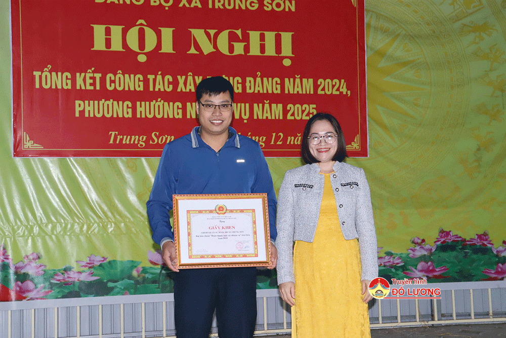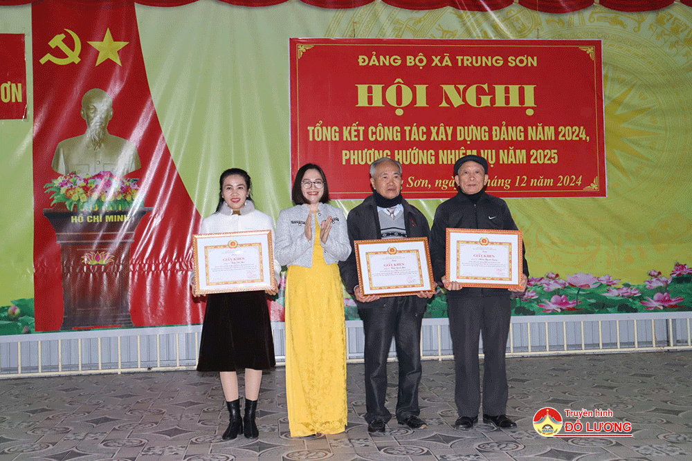 Tại hội nghị tổng kết, đồng chí Hoàng Thị Hồng Hạnh – Bí thư Đảng bộ xã và các đồng chí trong Đảng ủy xã Trung Sơn trao thưởng cho các tập thể, cá nhân có thành tích xuất sắc trong các phong trào của công tác xây dựng Đảng năm 2024, các cá nhân thực hiện tốt Chỉ thị 05.
