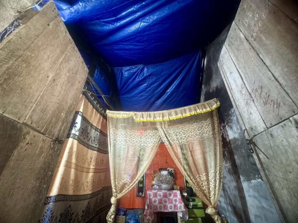 Hiện nay vợ chồng anh Hiếu cùng con thứ 2 đang ở trong ngôi nhà chật hẹp, xuống cấp, bên trong mái nhà phải căng bạt để tránh mưa dột xuống.