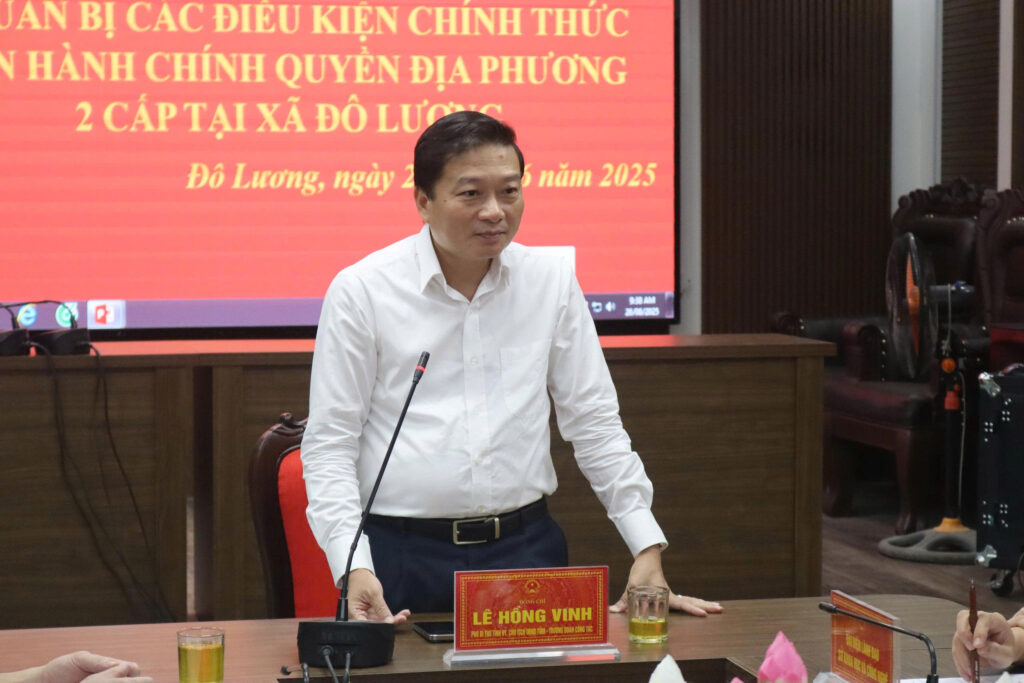 Chủ tịch UBND tỉnh Lê Hồng Vinh đánh giá cao sự chủ động, quyết liệt, bài bản của xã Đô Lương và huyện Đô Lương trong quá trình triển khai mô hình chính quyền địa phương 2 cấp; thể hiện rõ qua việc tiếp cận 1.065 nhiệm vụ thuộc cấp xã và các phòng chuyên môn cấp xã đã vào cuộc.