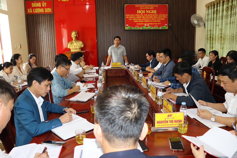 Chiều ngày 10/12, xã Lương Sơn đã tổ chức tổng kết công tác xây dựng Đảng, xây dựng hệ thống chính trị năm 2025; Tổng kết công tác kiểm tra giám sát cấp ủy năm 2025 và triển khai nhiệm vụ năm 2026. Đồng chí Nguyễn Hồng Xuân – Bí thư Đảng ủy xã chủ trì hội nghị. Dự hội nghị có các đồng chí Thường trực Đảng ủy; các đồng chí Ủy viên Ban Thường vụ Đảng ủy, Ủy viên Ban Chấp hành Đảng bộ xã.
