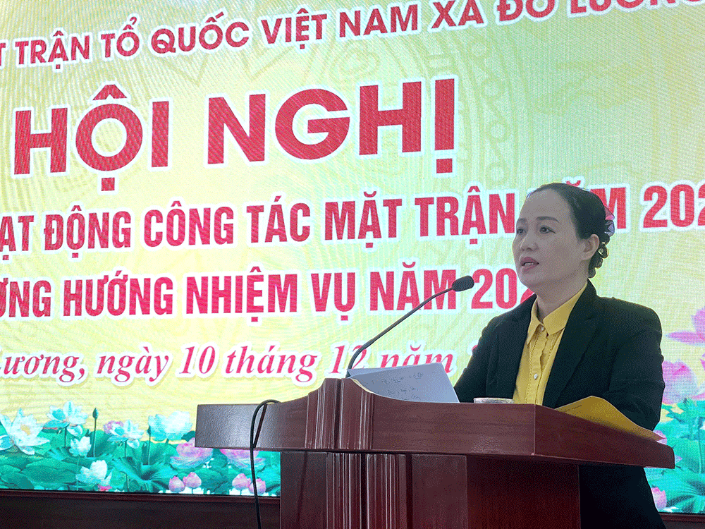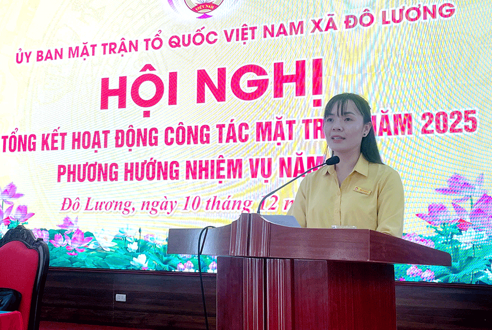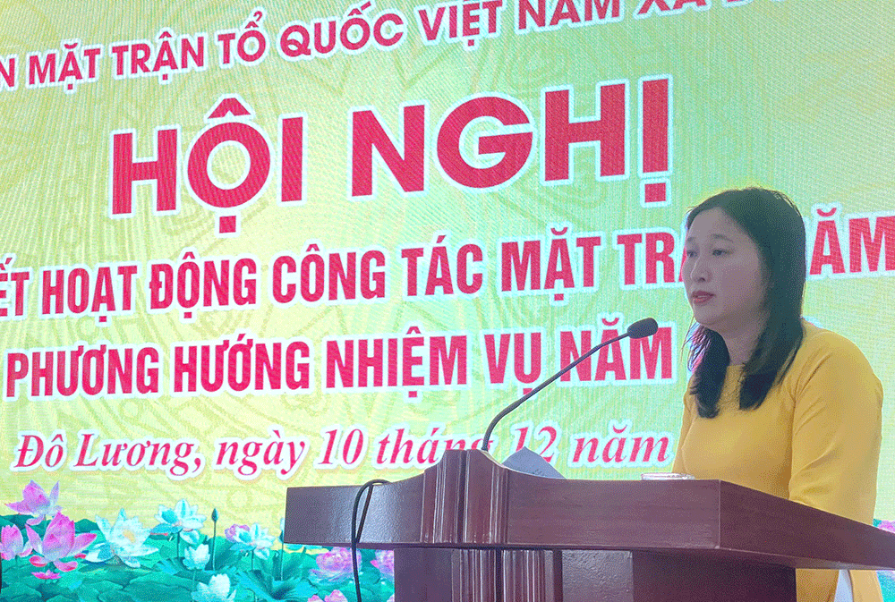 Phát biểu chỉ đạo tại Hội nghị, đồng chí Trần Thị Thu Hương ghi nhận những kết quả mà MTTQ xã Đô Lương đạt được trong năm 2025, đồng thời đề nghị Mặt trận xã tiếp tục phát huy tinh thần đoàn kết, đổi mới phương thức hoạt động; đẩy mạnh các phong trào thi đua; chủ động tham mưu cho cấp ủy, phối hợp chặt chẽ với chính quyền trong thực hiện các nhiệm vụ chính trị của địa phương. Năm 2026, Mặt trận xã cần tiếp tục phát huy kết quả đạt được, khắc phục tồn tại; nâng cao hiệu quả công tác tập hợp Nhân dân; tăng cường khối đại đoàn kết toàn dân tộc; góp phần thực hiện thắng lợi các mục tiêu phát triển kinh tế – xã hội của xã nhà.