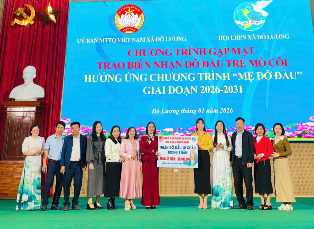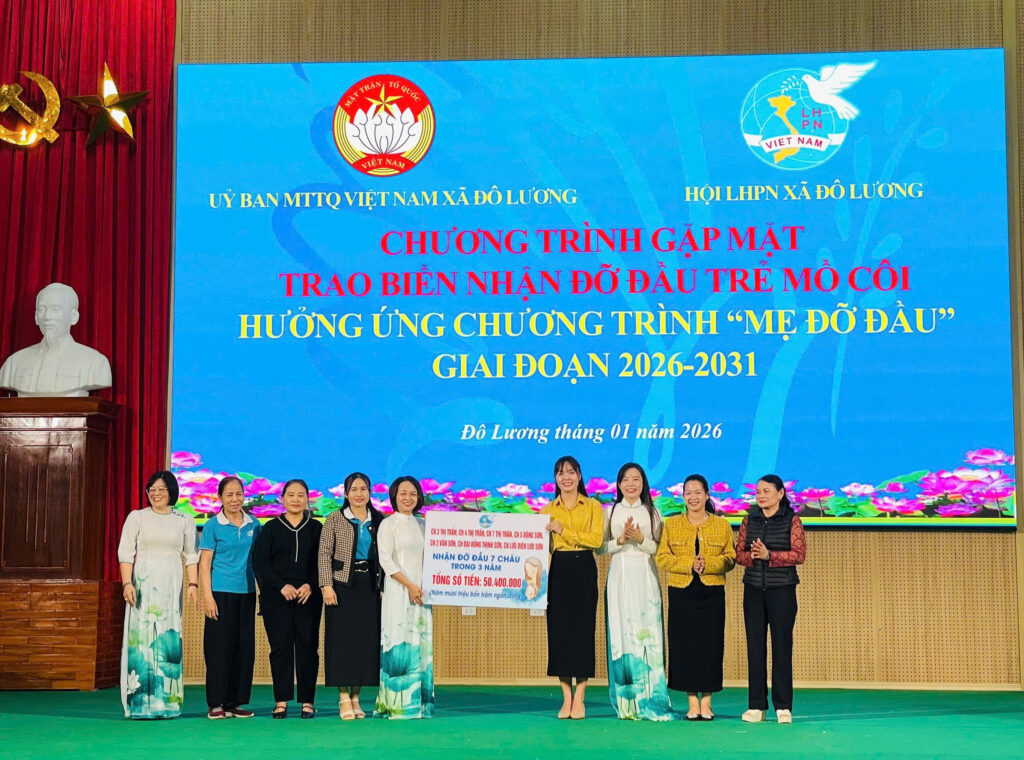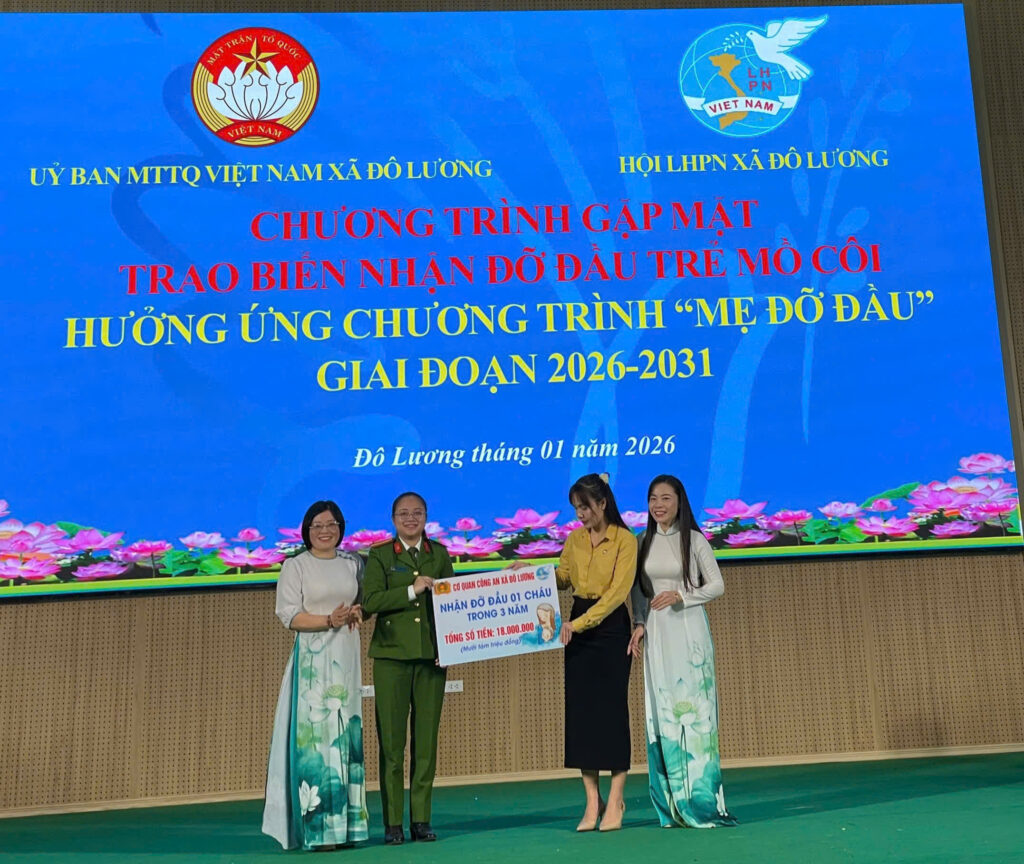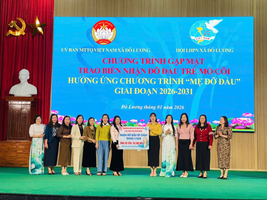 Sau 20 ngày kêu gọi và kết nối, tính đến ngày 15/1/2026, Hội LHPN xã Đô Lương đã kết nối, vận động nhận đỡ đầu cho 70 trẻ mồ côi, với tổng số tiền cam kết hỗ trợ 1 tỷ 10,8 triệu đồng, thời gian đỡ đầu bắt đầu từ tháng 1/2026.