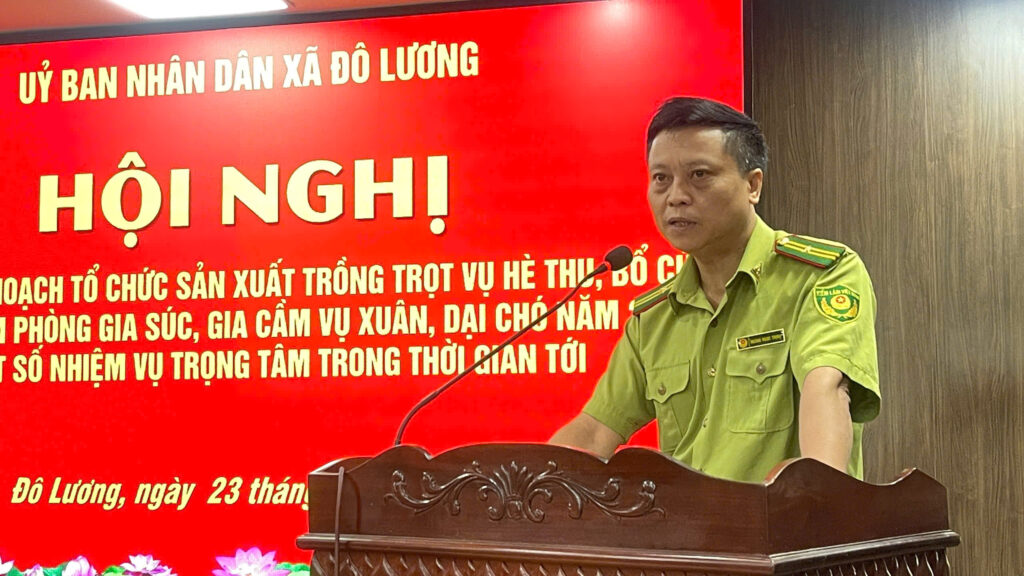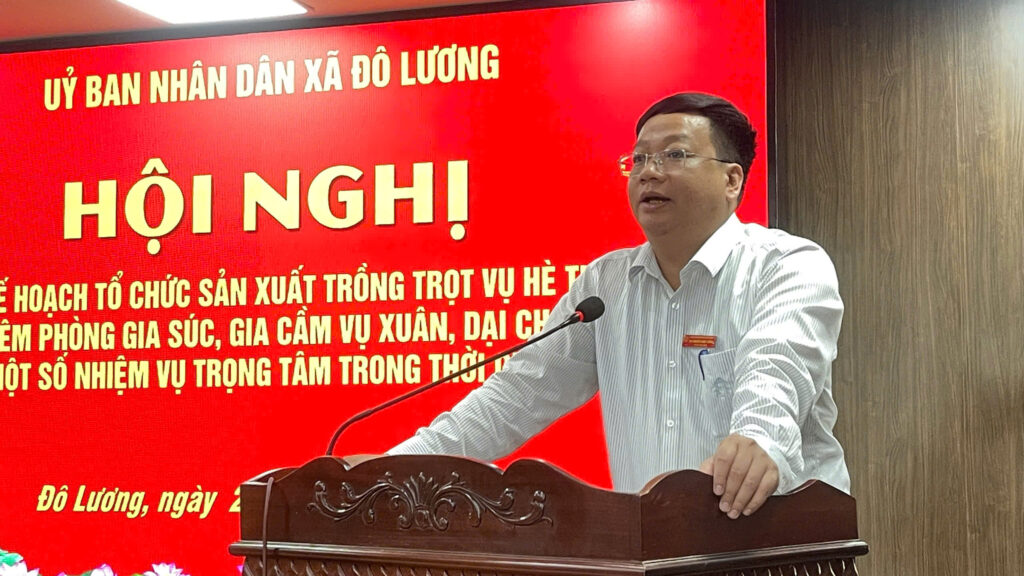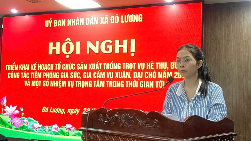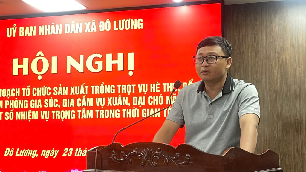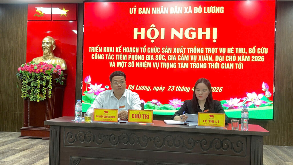 Sáng ngày 23/4, xã Đô Lương đã tổ chức hội nghị triển khai kế hoạch tổ chức sản xuất trồng trọt vụ Hè thu, bổ cứu công tác tiêm phòng gia súc, gia cầm vụ xuân, dại chó năm 2026 và một số nhiệm vụ trọng tâm trong thời gian tới. Chủ trì hội nghị có đồng chí Nguyễn Quốc Cường – Ủy viên BTV Đảng ủy, Phó Chủ tịch UBND xã và đồng chí Lê Thị Lý – Trưởng phòng Kinh tế chủ trì hội nghị.