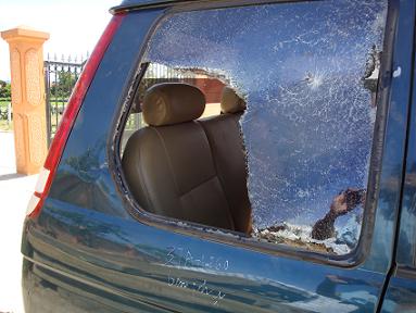 | Xe kiểm lâm bị đập vỡ kinh (ảnh: Ngọc Phương) |