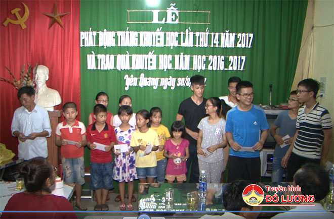 Tối ngày 30/8, xóm Yên Quang, xã Yên sơn đã tổ chức lễ phát động tháng khuyến học lần thứ 14 và trao thưởng khuyến học cho các em học sinh đạt thành tích cao trong học tập năm học 2016-2017. Về dự có ông Tăng Văn Tâm-Chủ tịch hội khuyến học huyện Đô Lương.