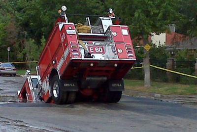 Một nhóm cứu hỏa ở thành phố Los Angeles nhận được một cú điện thoại thông báo vỡ đường ống nước gây lụt lội ở Valley Village chiều qua. Nó đang trên đường đến hiện trường thì lao xuống hố, Los Angeles Times đưa tin.