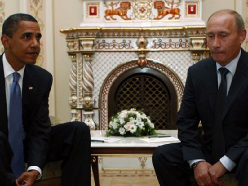Tổng thống Barack Obama (trái) và Thủ tướng Vladimir Putin lúng túng trong lần gặp đầu tiên – Ảnh: Reuters |
