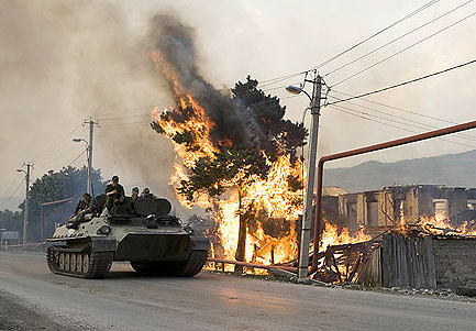 | Một chiếc xe bọc thép chở quân Nga chạy ngang qua ngôi nhà bị dân quân Nam Ossetia đốt cháy trên đất Gruzia tháng 8/2008. Ảnh: Time. |