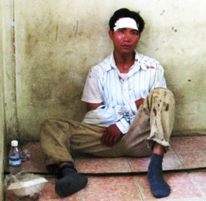 Sinh viên Khoa (trái) với nhiều vết bỏng ở tay và mắt. Sinh viên Hòa (phải) khi chạy theo thầy bị trượt vào vũng axít nên bị bỏng ở lưng.